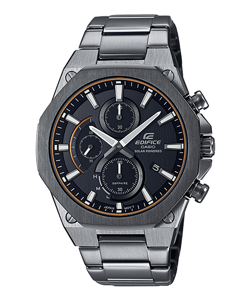 Slim Solar Powered Chronograph with Sapphire Crystal | Although multi-hand chronograph cases tend to be thick, this is a solar powered chronograph with a case kept to a thickness of 9.7 mm to provide an enhanced fit. The watch boasts a flat octagonal bezel with a hairline finish that creates a sporty yet luxurious design. Uses a scratch-resistant sapphire crystal. The combination of a case and band given a black ion plate for scratch-resistance and a red accent color creates a bold design.