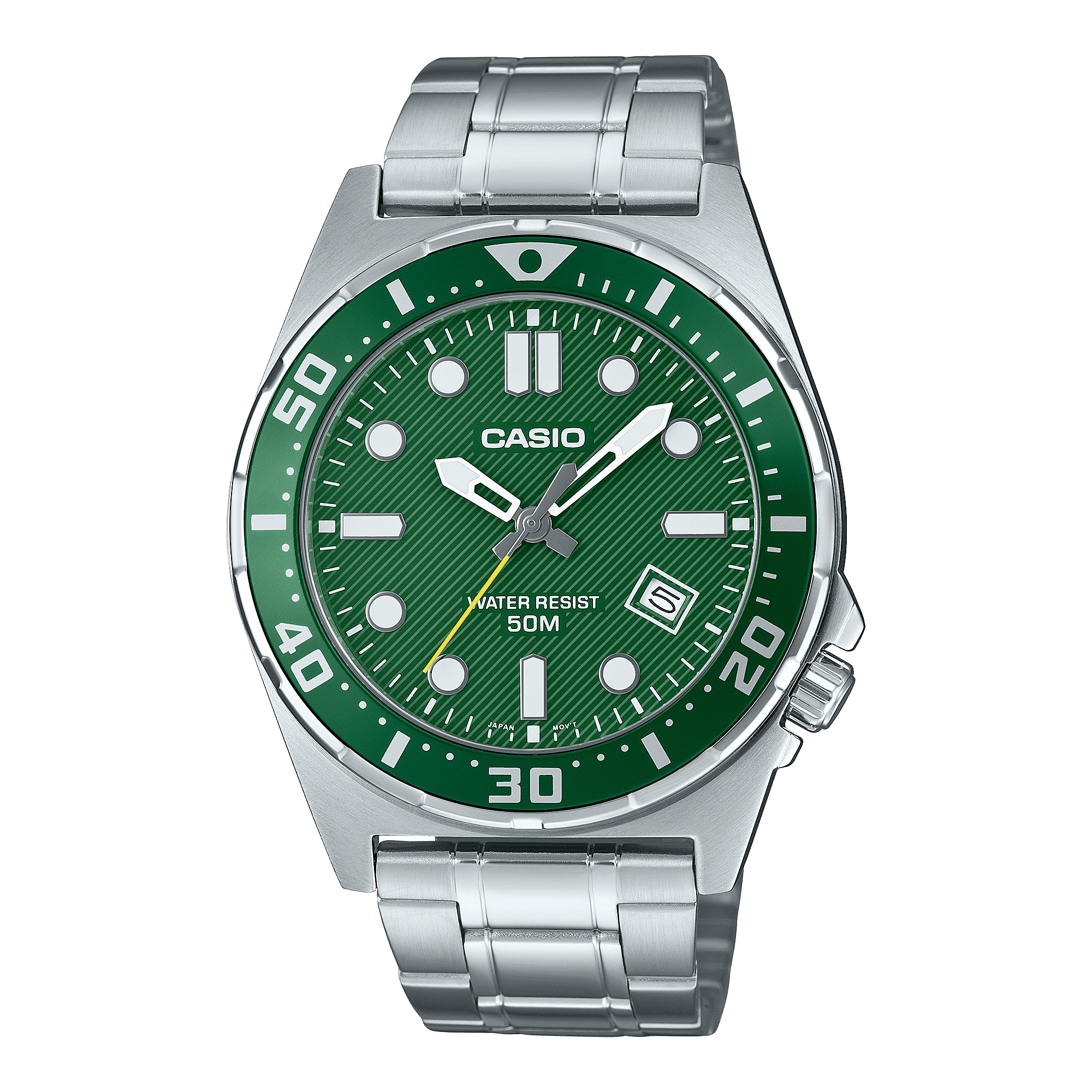 CASIO ENTICER MEN MTD-135D-3AVDF GREEN ANALOG DIAL SILVER STAINLESS STEEL BAND A2378