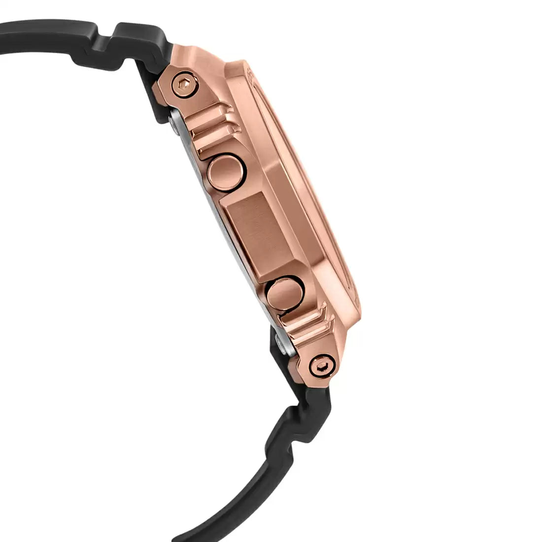 Go slim, clean and bold with a mid-sized G-SHOCK in a metal-clad octagonal take on the original iconic design. Forged in stainless steel with rounded hairline finish, the strong bezel says super style all the way. Onlythe lettering at the top and bottom are engraved, for a simple, one-piece design. The dial, flattened for slimness, is treated with ion plating color and mirrored indexes to add shimmery depth.