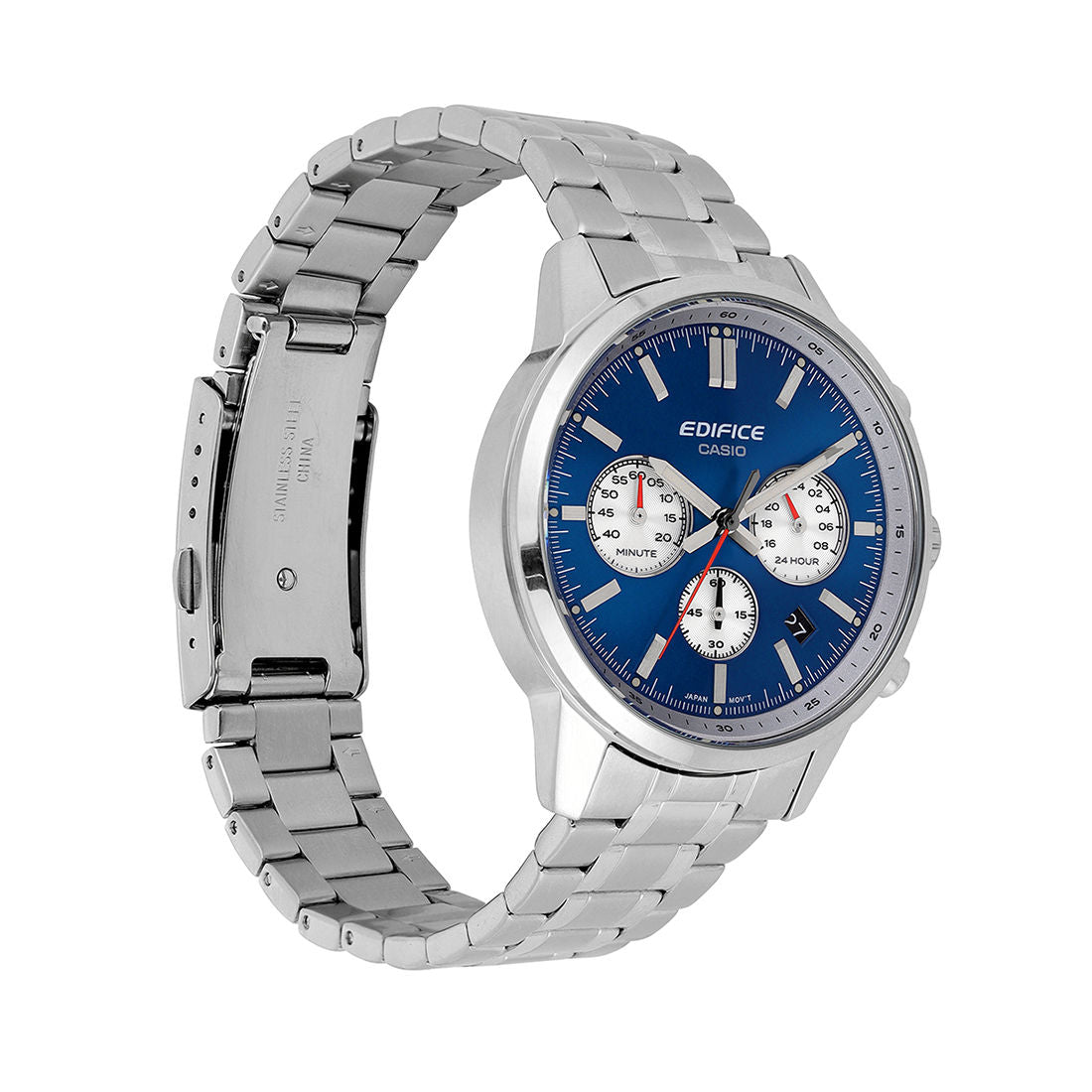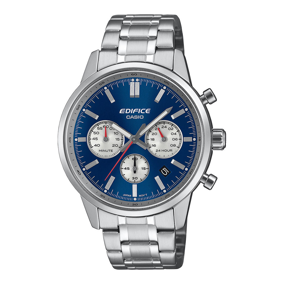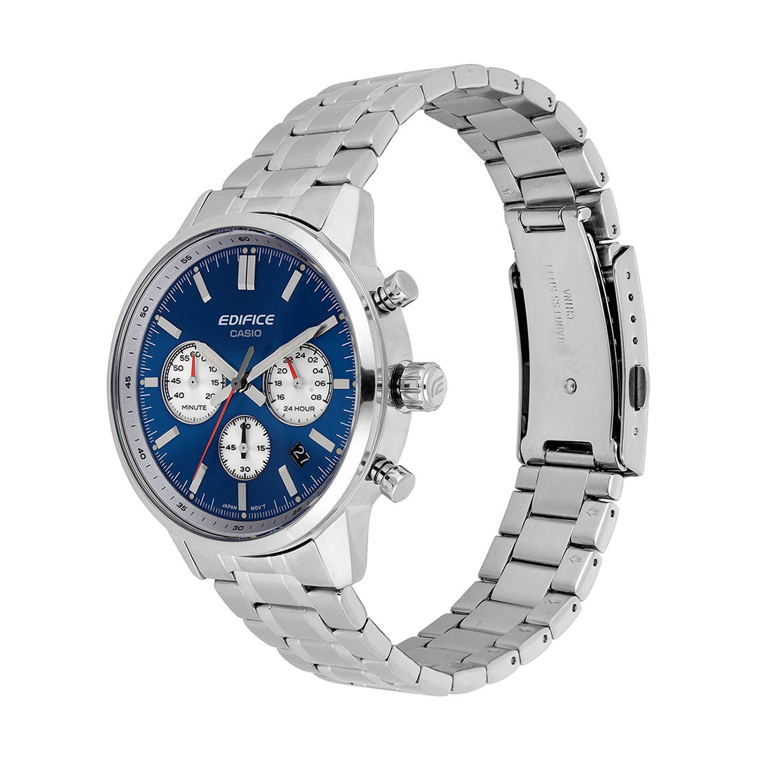 The EDIFICE chronograph inspired by the convex glass gauges of the classic sportscar. The two-tone dial features contrasting colors for the main and inset dials, evoking the look of a classic sportscar’s instrument panel. Details like the convex domed watch glass, stainless-steel case with narrow bezel, and push buttons round off the design with time-honored style.