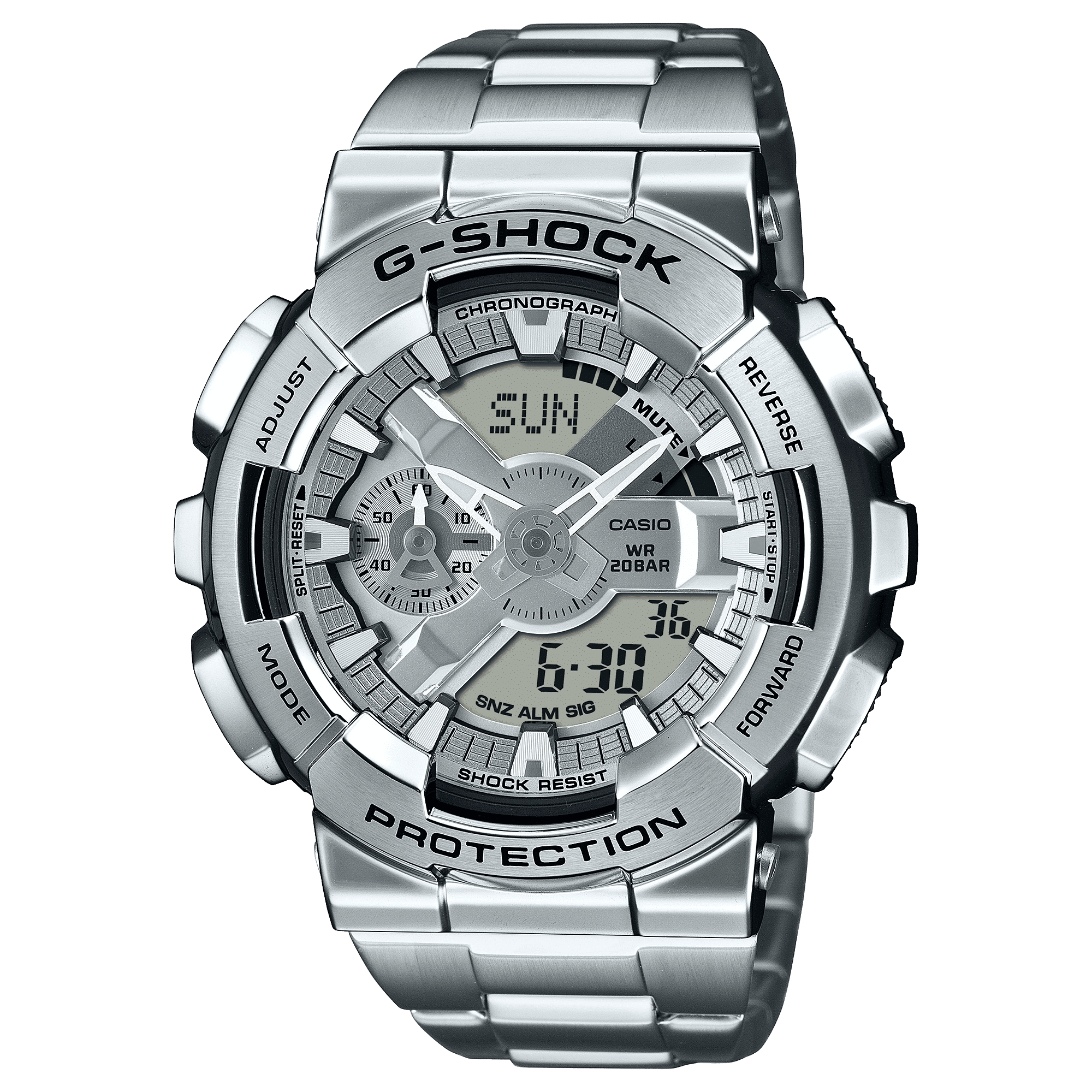 Introducing the GM-110BD, an updated take on the ever-popular large case analog-digital G-SHOCK with metal bezel and band. Precision forging, cutting, and polishing, and even special molding techniques, all go into crafting a metal bezel featuring a rugged, high-impact design, for a solid construction that sacrifices nothing in toughness. The case is made of fine resin to protect the module. With a metal band, all-black ion plating, and dial in a gold color, the GM-110BD-1A9 is up for anything — work or play.